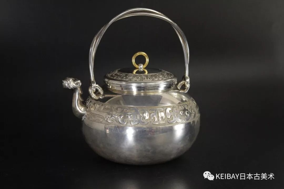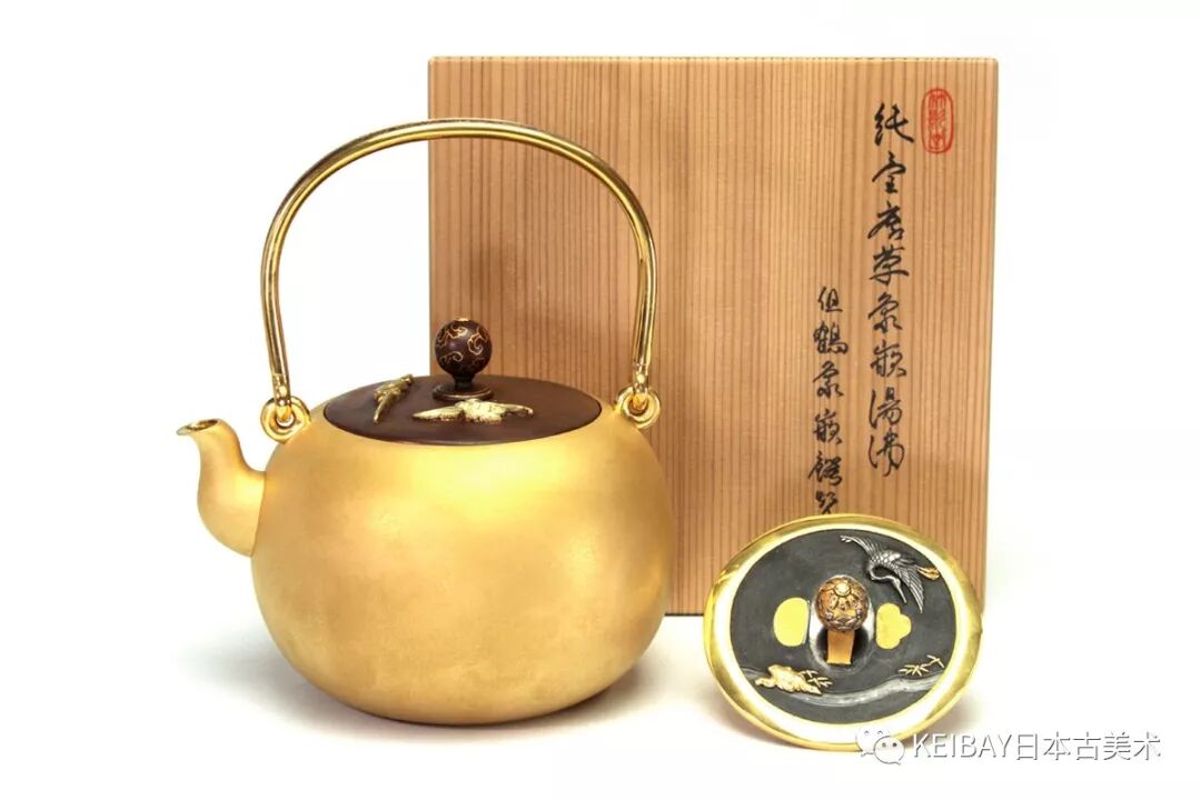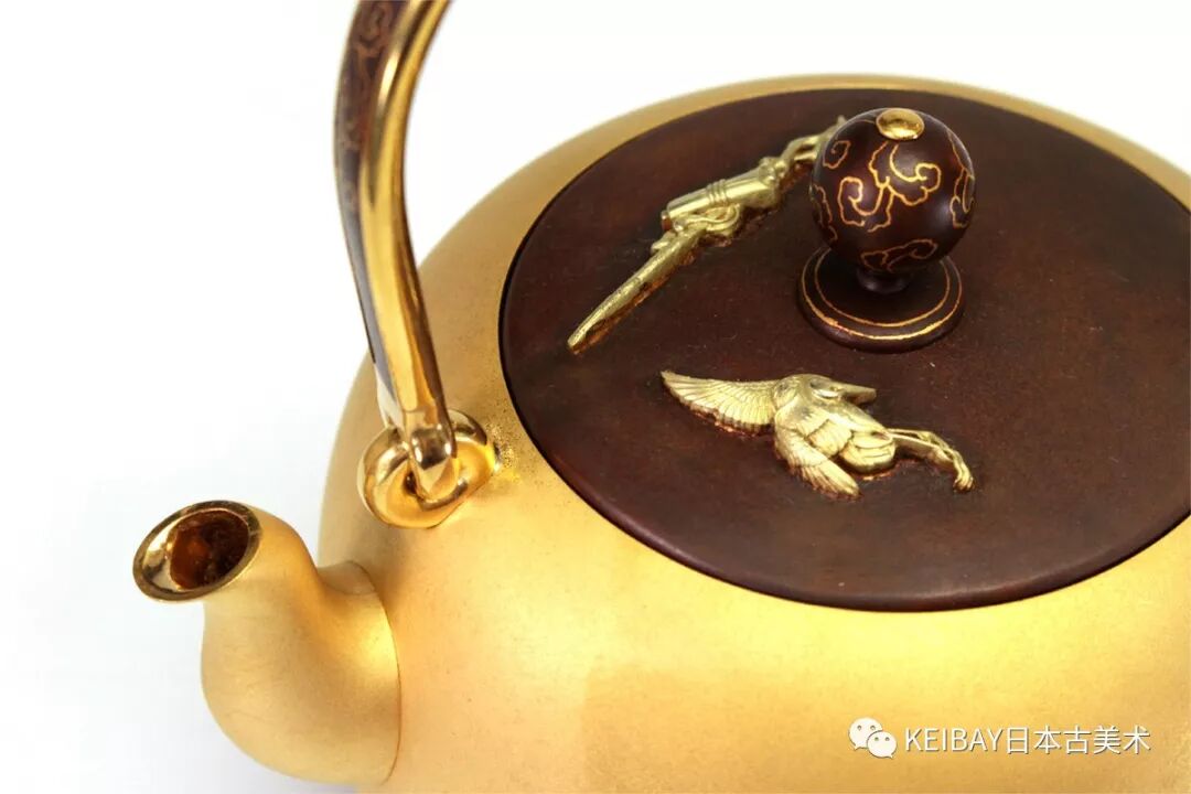 2、竹影堂榮真造 純金湯沸 唐草象嵌提(二重共箱)付雙蓋 其一吉岡因幡介作 金銀象嵌飛鶴鍔形蓋